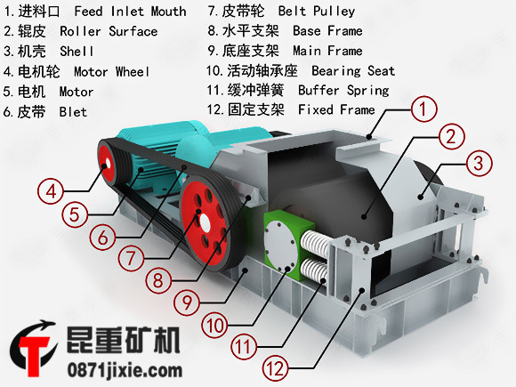 對輥式破碎機工作時,破碎物料經給料口落入兩輥子之間,進行擠壓破碎,成品物料自然落下。若遇過硬或不可破碎物時,對輥式破碎機的輥子可憑液壓缸或彈簧的作用自動退讓,使輥子間隙增大,過硬或不可破碎物落下,從而保護機器不受損壞。相向轉動的兩輥子有一定的間隙,改變間隙,即可控制產品最大排料粒度。雙輥破碎機是利用一對相向轉動的圓輥,四輥破碎機則是利用兩對相向轉動的圓輥進行破碎作業。