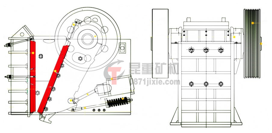 顎式破碎機的工作方式是由電動機驅(qū)動皮帶和皮帶輪,通過偏心軸使動顎上下運動,當(dāng)動顎上升時肘板與動顎間夾角變大,從而推動動顎板向固定顎板接近,與其同時物料被壓碎或劈碎,達(dá)到破碎的目的。當(dāng)動顎下行時,肘板與動顎夾角變小,動顎板在拉桿,彈簧的作用下,離開固定顎板,此時已破碎物料從破碎腔下口排出。隨著電動機連續(xù)轉(zhuǎn)動而破碎機動顎做周期運動壓碎和排泄物料,實現(xiàn)批量生產(chǎn)。